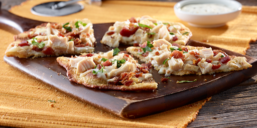 Chop bacon into bits and place aside. Something the kids will eat? Spread ranch dressing over crust. Top each flatbread with 1 1/4 ounces (1/4 cup) diced chicken, 2 ounces (1/2 cup) extra melt shredded american cheese and 1 1/4 ounces (1/4 cup) bacon. Fully baked rustic flatbread 12 x 5 in oval (#13162) 1/8 c: